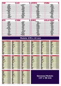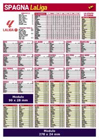 | Completo di dati e statistiche riguardanti i campionati di calcio italiani e dei maggiori campionati europei allo scopo di arricchire i contenuti che già offrite ai vostri lettori | Lo riceverete via mail (file elettronico - PDF) entro le 23:00 del giovedì (entro le 23:00 del lunedì in caso di turno infrasettimanale) |